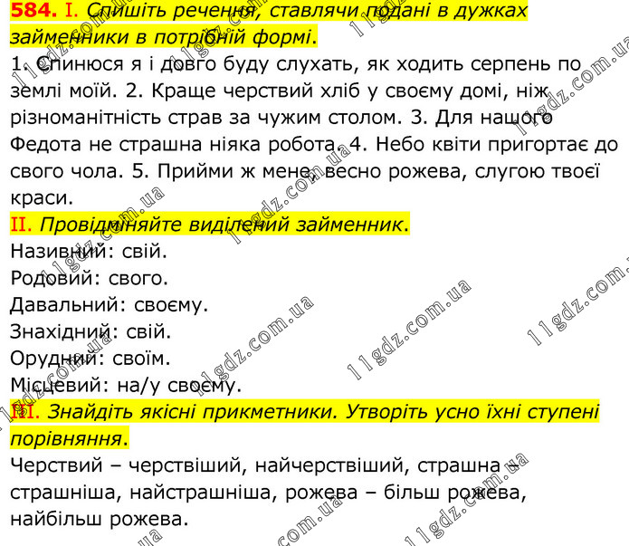 І. Спишіть речення, ставлячи подані в дужках займенники в потрібній формі. 1. Спинюся я і довго буду слухать, як ходить серпень по землі моїй. 2. Краще черствий хліб у своєму домі, ніж різноманітність страв за чужим столом. 3. Для нашого Федота не страшна ніяка робота. 4. Небо квіти пригортає до свого чола. 5. Прийми ж мене, весно рожева, слугою твоєї краси. ІІ. Провідміняйте виділений займенник. Називний: свій. Родовий: свого. Давальний: своєму. Знахідний: свій. Орудний: своїм. Місцевий: на/у своєму. ІІІ. Знайдіть якісні прикметники. Утворіть усно їхні ступені порівняння. Черствий – черствіший, найчерствіший, страшна – страшніша, найстрашніша, рожева – більш рожева, найбільш рожева.