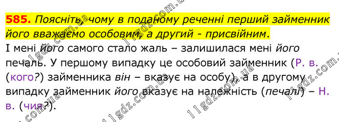 Поясніть, чому в поданому реченні перший займенник його вважаємо особовим, а другий - присвійним. І мені його самого стало жаль – залишилася мені його печаль. У першому випадку це особовий займенник (Р. в. (кого?) займенника він – вказує на особу), а в другому випадку займенник його вказує на належність (печалі) – Н. в. (чия?).