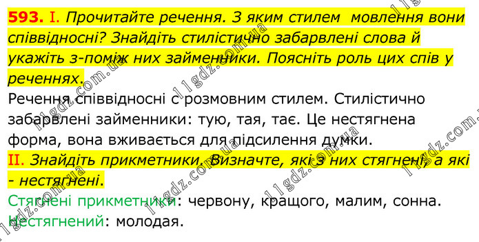 І. Прочитайте речення. З яким стилем мовлення вони співвідносні? Знайдіть стилістично забарвлені слова й укажіть з-поміж них займенники. Поясніть роль цих спів у реченнях. Речення співвідносні с розмовним стилем. Стилістично забарвлені займенники: тую, тая, тає. Це нестягнена форма, вона вживається для підсилення думки. ІІ. Знайдіть прикметники. Визначте, які з них стягнені, а які - нестягнені. Стягнені прикметники: червону, кращого, малим, сонна. Нестягнений: молодая.