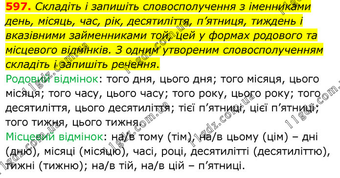 Складіть і запишіть словосполучення з іменниками день, місяць, час, рік, десятиліття, п’ятниця, тиждень і вказівними займенниками той, цей у формах родового та місцевого відмінків. З одним утвореним словосполученням складіть і запишіть речення. Родовий відмінок: того дня, цього дня; того місяця, цього місяця; того часу, цього часу; того року, цього року; того десятиліття, цього десятиліття; тієї п’ятниці, цієї п’ятниці; того тижня, цього тижня. Місцевий відмінок: на/в тому (тім), на/в цьому (цім) – дні (дню), місяці (місяцю), часі, році, десятилітті (десятиліттю), тижні (тижню); на/в тій, на/в цій – п’ятниці.