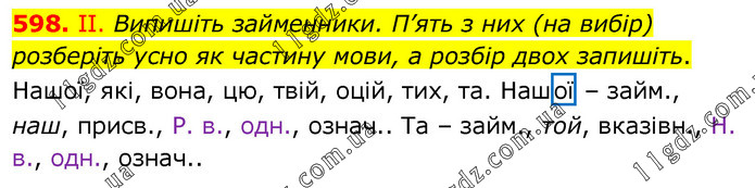 ІІ. Випишіть займенники. П’ять з них (на вибір) розберіть усно як частину мови, а розбір двох запишіть. Нашої, які, вона, цю, твій, оцій, тих, та. Нашої – займ., наш, присв., Р. в., одн., означ.. Та – займ., той, вказівн., Н. в., одн., означ..