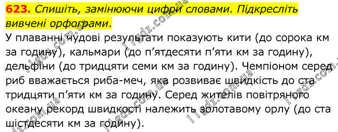 623. Спишіть, замінюючи цифри словами. Підкресліть вивчені орфограми. У плаванні чудові результати показують кити (до сорока км за годину), кальмари (до п’ятдесяти п’яти км за годину), дельфіни (до тридцяти семи км за годину). Чемпіоном серед риб вважається риба-меч, яка розвиває швидкість до ста тридцяти п’яти км за годину. Серед жителів повітряного океану рекорд швидкості належить золотавому орлу (до ста шістдесяти км за годину).