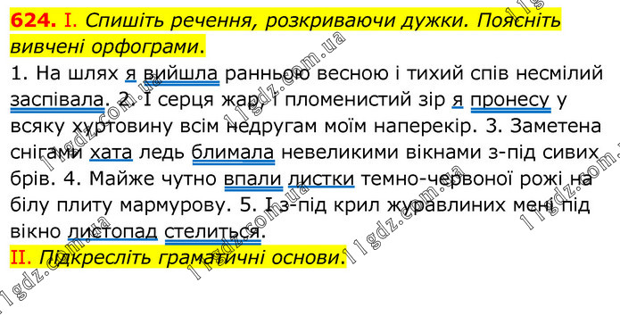 І. Спишіть речення, розкриваючи дужки. Поясніть вивчені орфограми. 1. На шлях я вийшла ранньою весною і тихий спів несмілий заспівала. 2. І серця жар, і пломенистий зір я пронесу у всяку хуртовину всім недругам моїм наперекір. 3. Заметена снігами хата ледь блимала невеликими вікнами з-під сивих брів. 4. Майже чутно впали листки темно-червоної рожі на білу плиту мармурову. 5. І з-під крил журавлиних мені під вікно листопад стелиться. II. Підкресліть граматичні основи.
