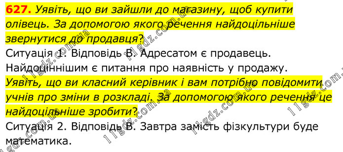Уявіть, що ви зайшли до магазину, щоб купити олівець. За допомогою якого речення найдоцільніше звернутися до продавця? Ситуація 1. Відповідь В. Адресатом є продавець. Найдоціннішим є питання про наявність у продажу. Уявіть, що ви класний керівник і вам потрібно повідомити учнів про зміни в розкладі. За допомогою якого речення це найдоцільніше зробити? Ситуація 2. Відповідь В. Завтра замість фізкультури буде математика.