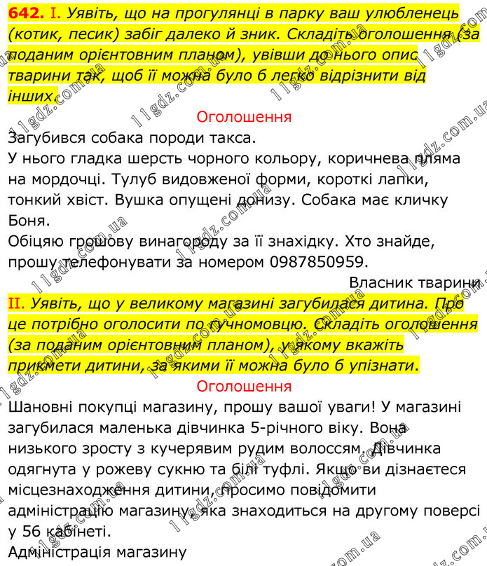 І. Уявіть, що на прогулянці в парку ваш улюбленець (котик, песик) забіг далеко й зник. Складіть оголошення (за поданим орієнтовним планом), увівши до нього опис тварини так, щоб її можна було б легко відрізнити від інших. Оголошення Загубився собака породи такса. У нього гладка шерсть чорного кольору, коричнева пляма на мордочці. Тулуб видовженої форми, короткі лапки, тонкий хвіст. Вушка опущені донизу. Собака має кличку Боня. Обіцяю грошову винагороду за її знахідку. Хто знайде, прошу телефонувати за номером 0987850959. Власник тварини II. Уявіть, що у великому магазині загубилася дитина. Про це потрібно оголосити по гучномовцю. Складіть оголошення (за поданим орієнтовним планом), у якому вкажіть прикмети дитини, за якими її можна було б упізнати. Оголошення Шановні покупці магазину, прошу вашої уваги! У магазині загубилася маленька дівчинка 5-річного віку. Вона низького зросту з кучерявим рудим волоссям. Дівчинка одягнута у рожеву сукню та білі туфлі. Якщо ви дізнаєтеся місцезнаходження дитини, просимо повідомити адміністрацію магазину, яка знаходиться на другому поверсі у 56 кабінеті. Адміністрація магазину