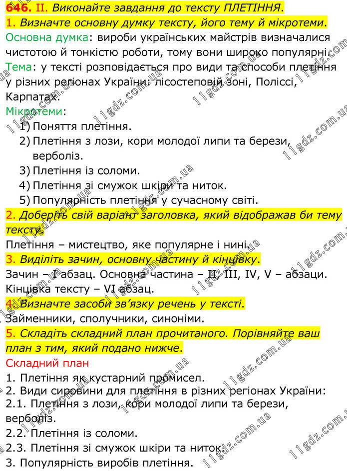II. Виконайте завдання до тексту ПЛЕТІННЯ. 1. Визначте основну думку тексту, його тему й мікротеми. Основна думка: вироби українських майстрів визначалися чистотою й тонкістю роботи, тому вони широко популярні. Тема: у тексті розповідається про види та способи плетіння у різних регіонах України: лісостеповій зоні, Поліссі, Карпатах. Мікротеми: 1) Поняття плетіння. 2) Плетіння з лози, кори молодої липи та берези, верболіз. 3) Плетіння із соломи. 4) Плетіння зі смужок шкіри та ниток. 5) Популярність плетіння у сучасному світі. 2. Доберіть свій варіант заголовка, який відображав би тему тексту. Плетіння – мистецтво, яке популярне і нині. 3. Виділіть зачин, основну частину й кінцівку. Зачин – І абзац. Основна частина – ІІ, ІІІ, ІV, V – абзаци. Кінцівка тексту – VІ абзац. 4. Визначте засоби зв’язку речень у тексті. Займенники, сполучники, синоніми. 5. Складіть складний план прочитаного. Порівняйте ваш план з тим, який подано нижче. Складний план 1. Плетіння як кустарний промисел. 2. Види сировини для плетіння в різних регіонах України: 2.1. Плетіння з лози, кори молодої липи та берези, верболіз. 2.2. Плетіння із соломи. 2.3. Плетіння зі смужок шкіри та ниток. 3. Популярність виробів плетіння.