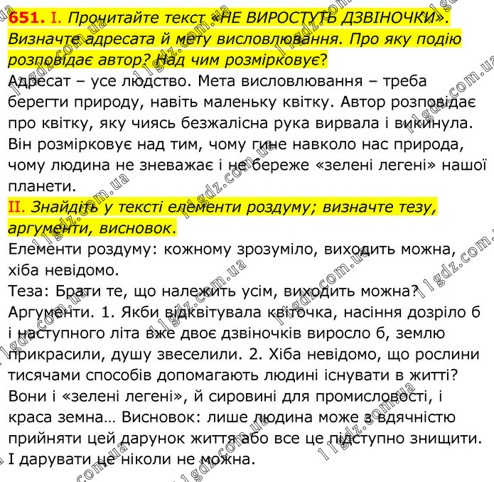 І. Прочитайте текст «НЕ ВИРОСТУТЬ ДЗВІНОЧКИ». Визначте адресата й мету висловлювання. Про яку подію розповідає автор? Над чим розмірковує? Адресат – усе людство. Мета висловлювання – треба берегти природу, навіть маленьку квітку. Автор розповідає про квітку, яку чиясь безжалісна рука вирвала і викинула. Він розмірковує над тим, чому гине навколо нас природа, чому людина не зневажає і не береже «зелені легені» нашої планети. ІІ. Знайдіть у тексті елементи роздуму; визначте тезу, аргументи, висновок. Елементи роздуму: кожному зрозуміло, виходить можна, хіба невідомо. Теза: Брати те, що належить усім, виходить можна? Аргументи. 1. Якби відквітувала квіточка, насіння дозріло б і наступного літа вже двоє дзвіночків виросло б, землю прикрасили, душу звеселили. 2. Хіба невідомо, що рослини тисячами способів допомагають людині існувати в житті? Вони і «зелені легені», й сировині для промисловості, і краса земна… Висновок: лише людина може з вдячністю прийняти цей дарунок життя або все це підступно знищити. І дарувати це ніколи не можна.