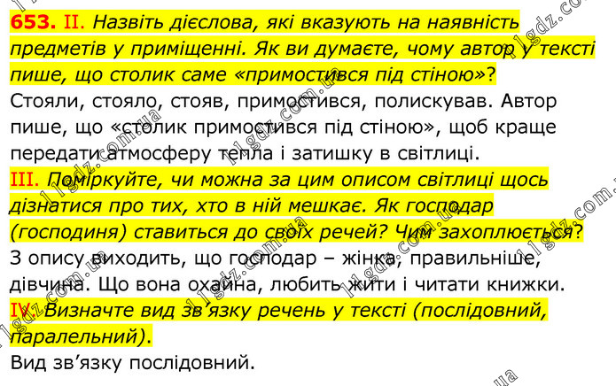 ІІ. Назвіть дієслова, які вказують на наявність предметів у приміщенні. Як ви думаєте, чому автор у тексті пише, що столик саме «примостився під стіною»? Стояли, стояло, стояв, примостився, полискував. Автор пише, що «столик примостився під стіною», щоб краще передати атмосферу тепла і затишку в світлиці. ІІІ. Поміркуйте, чи можна за цим описом світлиці щось дізнатися про тих, хто в ній мешкає. Як господар (господиня) ставиться до своїх речей? Чим захоплюється? З опису виходить, що господар – жінка, правильніше, дівчина. Що вона охайна, любить жити і читати книжки. ІV. Визначте вид зв’язку речень у тексті (послідовний, паралельний). Вид зв’язку послідовний.