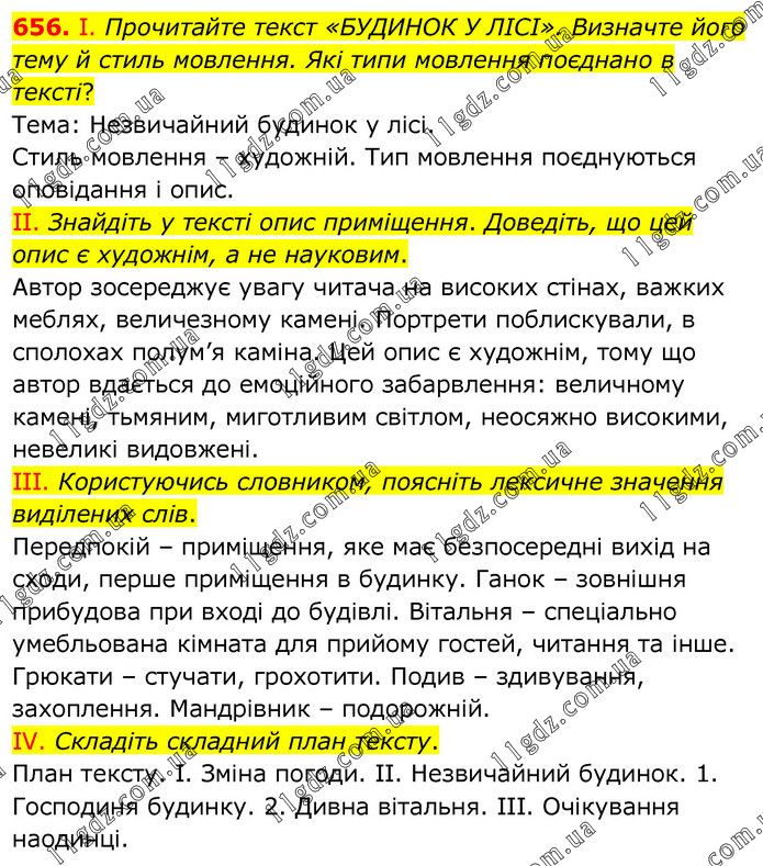 І. Прочитайте текст «БУДИНОК У ЛІСІ». Визначте його тему й стиль мовлення. Які типи мовлення поєднано в тексті? Тема: Незвичайний будинок у лісі. Стиль мовлення – художній. Тип мовлення поєднуються оповідання і опис. ІІ. Знайдіть у тексті опис приміщення. Доведіть, що цей опис є художнім, а не науковим. Автор зосереджує увагу читача на високих стінах, важких меблях, величезному камені. Портрети поблискували, в сполохах полум’я каміна. Цей опис є художнім, тому що автор вдається до емоційного забарвлення: величному камені, тьмяним, миготливим світлом, неосяжно високими, невеликі видовжені. ІІІ. Користуючись словником, поясніть лексичне значення виділених слів. Передпокій – приміщення, яке має безпосередні вихід на сходи, перше приміщення в будинку. Ганок – зовнішня прибудова при вході до будівлі. Вітальня – спеціально умебльована кімната для прийому гостей, читання та інше. Грюкати – стучати, грохотити. Подив – здивування, захоплення. Мандрівник – подорожній. ІV. Складіть складний план тексту. План тексту. І. Зміна погоди. ІІ. Незвичайний будинок. 1. Господиня будинку. 2. Дивна вітальня. ІІІ. Очікування наодинці.