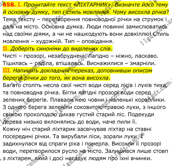 І. Прочитайте текст «ЛІХТАРНИК». Визначте його тему й основну думку, тип і стиль мовлення. Чому висохла річка? Тема тексту – перетворення повноводної річки на струмок і далі на місто. Основна думка. Люди повинні замислюватись над своїми діями, а чи не нашкодують вони довкіллю! Стиль мовлення – художній. Тип – оповідання. ІІ. Доберіть синоніми до виділених слів. Чисті – прозорі, незабруднені. Лагідно – ніжно, ласкаво. Тішилась – раділа, втішалась. Виснажилися – змарніли. ІІІ. Напишіть докладний переказ, доповнивши описом берегів річки до того, як вона висохла. Багато століть несла свої чисті води серед лісів і луків тиха, та повноводна річка. Бігли лагідні прозорі води серед зелених берегів. Плавали нею човни і маленькі кораблики. З одного берега зеленіли соковитою травою луки, з іншого свіжою прохолодою дихав густий старий ліс. Подекуди дерева низько вклонялись до води, наче пили її. Кожну ніч старий ліхтарик засвічував ліхтар на ставні посередині річки. Та вирубали ліси, зорали луки. І задихнулася від спраги ріка і померла. Висохли її прозорі води, перетворилося русло на місто. Залишився лише стовп з ліхтарем, який і досі нагадує людям про їхні вчинки.