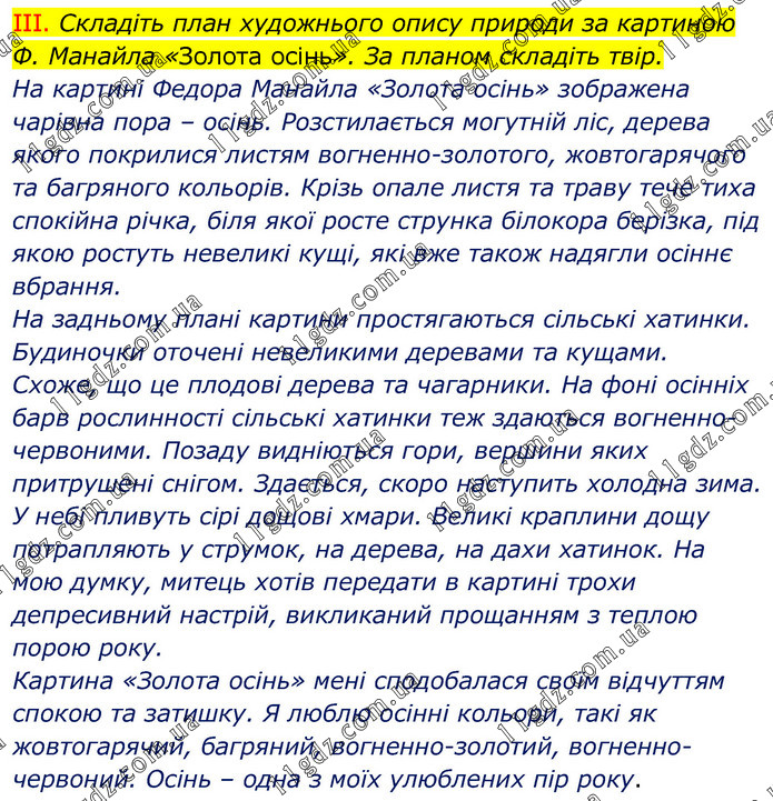 III. Складіть план художнього опису природи за картиною Ф. Манайла «Золота осінь». За планом складіть твір. На картині Федора Манайла «Золота осінь» зображена чарівна пора – осінь. Розстилається могутній ліс, дерева якого покрилися листям вогненно-золотого, жовтогарячого та багряного кольорів. Крізь опале листя та траву тече тиха спокійна річка, біля якої росте струнка білокора берізка, під якою ростуть невеликі кущі, які вже також надягли осіннє вбрання. На задньому плані картини простягаються сільські хатинки. Будиночки оточені невеликими деревами та кущами. Схоже, що це плодові дерева та чагарники. На фоні осінніх барв рослинності сільські хатинки теж здаються вогненно-червоними. Позаду видніються гори, вершини яких притрушені снігом. Здається, скоро наступить холодна зима. У небі пливуть сірі дощові хмари. Великі краплини дощу потрапляють у струмок, на дерева, на дахи хатинок. На мою думку, митець хотів передати в картині трохи депресивний настрій, викликаний прощанням з теплою порою року. Картина «Золота осінь» мені сподобалася своїм відчуттям спокою та затишку. Я люблю осінні кольори, такі як жовтогарячий, багряний, вогненно-золотий, вогненно-червоний. Осінь – одна з моїх улюблених пір року.