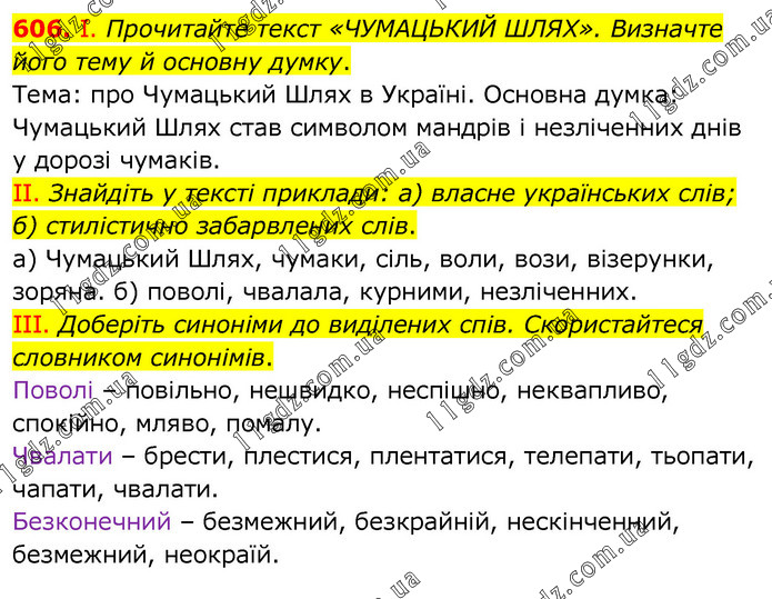 І. Прочитайте текст «ЧУМАЦЬКИЙ ШЛЯХ». Визначте його тему й основну думку. Тема: про Чумацький Шлях в Україні. Основна думка: Чумацький Шлях став символом мандрів і незліченних днів у дорозі чумаків. II. Знайдіть у тексті приклади: а) власне українських слів; б) стилістично забарвлених слів. а) Чумацький Шлях, чумаки, сіль, воли, вози, візерунки, зоряна. б) поволі, чвалала, курними, незліченних. ІІІ. Доберіть синоніми до виділених спів. Скористайтеся словником синонімів. Поволі – повільно, нешвидко, неспішно, неквапливо, спокійно, мляво, помалу. Чвалати – брести, плестися, плентатися, телепати, тьопати, чапати, чвалати. Безконечний – безмежний, безкрайній, нескінченний, безмежний, неокраїй.