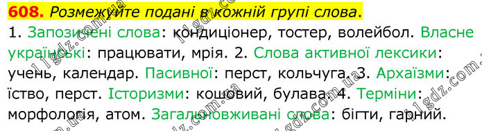 Розмежуйте подані в кожній групі слова. 1. Запозичені слова: кондиціонер, тостер, волейбол. Власне українські: працювати, мрія. 2. Слова активної лексики: учень, календар. Пасивної: перст, кольчуга. 3. Архаїзми: їство, перст. Історизми: кошовий, булава. 4. Терміни: морфологія, атом. Загальновживані слова: бігти, гарний.