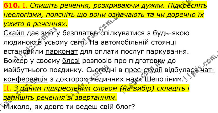 І. Спишіть речення, розкриваючи дужки. Підкресліть неологізми, поясніть що вони означають та чи доречно їх ужито в реченнях. Скайп дає змогу безплатно спілкуватися з будь-якою людиною в усьому світі. На автомобільній стоянці встановили паркомат для оплати послуг паркування. Боксер у своєму блозі розповів про підготовку до майбутнього поєдинку. Сьогодні в прес-студії відбулася чат-конференція з доктором медичних наук Шепотіним. ІІ. З одним підкресленим словом (на вибір) складіть і запишіть речення зі звертанням. Миколо, як довго ти ведеш свій блог?