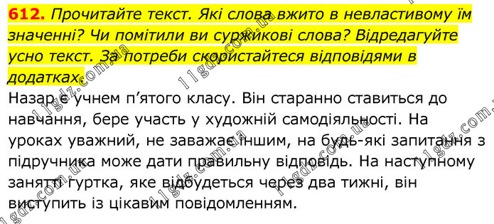 Прочитайте текст. Які слова вжито в невластивому їм значенні? Чи помітили ви суржикові слова? Відредагуйте усно текст. За потреби скористайтеся відповідями в додатках. Назар є учнем п’ятого класу. Він старанно ставиться до навчання, бере участь у художній самодіяльності. На уроках уважний, не заважає іншим, на будь-які запитання з підручника може дати правильну відповідь. На наступному занятті гуртка, яке відбудеться через два тижні, він виступить із цікавим повідомленням.