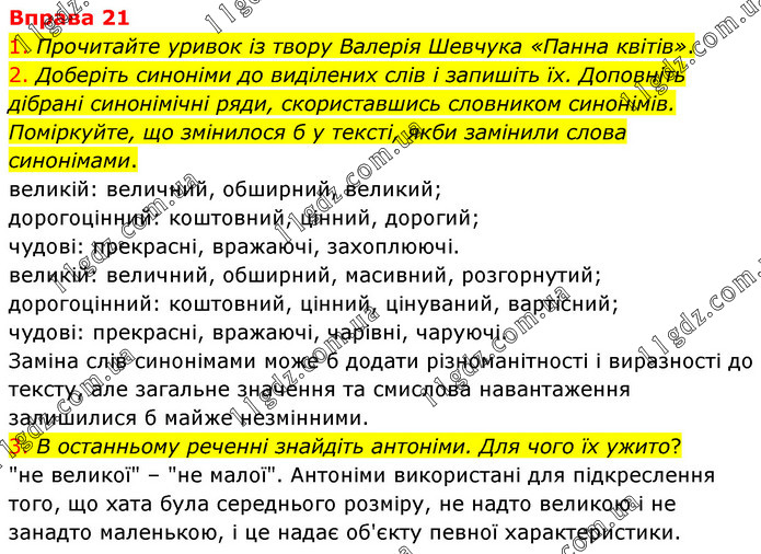 1. Прочитайте уривок із твору Валерія Шевчука «Панна квітів». 2. Доберіть синоніми до виділених слів і запишіть їх. Доповніть дібрані синонімічні ряди, скориставшись словником синонімів. Поміркуйте, що змінилося б у тексті, якби замінили слова синонімами. великій: величний, обширний, великий; дорогоцінний: коштовний, цінний, дорогий; чудові: прекрасні, вражаючі, захоплюючі. великій: величний, обширний, масивний, розгорнутий; дорогоцінний: коштовний, цінний, цінуваний, вартісний; чудові: прекрасні, вражаючі, чарівні, чаруючі. Заміна слів синонімами може б додати різноманітності і виразності до тексту, але загальне значення та смислова навантаження залишилися б майже незмінними. 3. В останньому реченні знайдіть антоніми. Для чого їх ужито? "не великої" – "не малої". Антоніми використані для підкреслення того, що хата була середнього розміру, не надто великою і не занадто маленькою, і це надає об'єкту певної характеристики.
