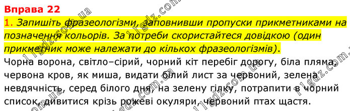1. Запишіть фразеологізми, заповнивши пропуски прикметниками на позначення кольорів. За потреби скористайтеся довідкою (один прикметник може належати до кількох фразеологізмів). Чорна ворона, світло–сірий, чорний кіт перебіг дорогу, біла пляма, червона кров, як миша, видати білий лист за червоний, зелена невдячність, серед білого дня, на зелену гілку, потрапити в чорний список, дивитися крізь рожеві окуляри, червоний птах щастя.