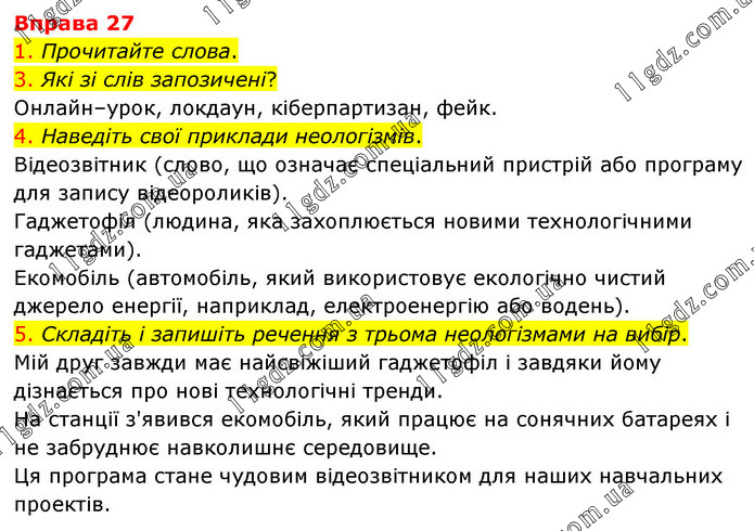 1. Прочитайте слова. 3. Які зі слів запозичені? Онлайн–урок, локдаун, кіберпартизан, фейк. 4. Наведіть свої приклади неологізмів. Відеозвітник (слово, що означає спеціальний пристрій або програму для запису відеороликів). Гаджетофіл (людина, яка захоплюється новими технологічними гаджетами). Екомобіль (автомобіль, який використовує екологічно чистий джерело енергії, наприклад, електроенергію або водень). 5. Складіть і запишіть речення з трьома неологізмами на вибір. Мій друг завжди має найсвіжіший гаджетофіл і завдяки йому дізнається про нові технологічні тренди. На станції з'явився екомобіль, який працює на сонячних батареях і не забруднює навколишнє середовище. Ця програма стане чудовим відеозвітником для наших навчальних проектів.