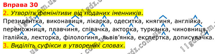 2. Утворіть фемінітиви від поданих іменників. Президентка, виконавиця, лікарка, одеситка, княгиня, англійка, переможниця, плавчиня, співачка, акторка, турканка, чиновниця, італійка, лекторка, філологиня, львів’янка, експертка, дописувачка. 3. Виділіть суфікси в утворених словах.