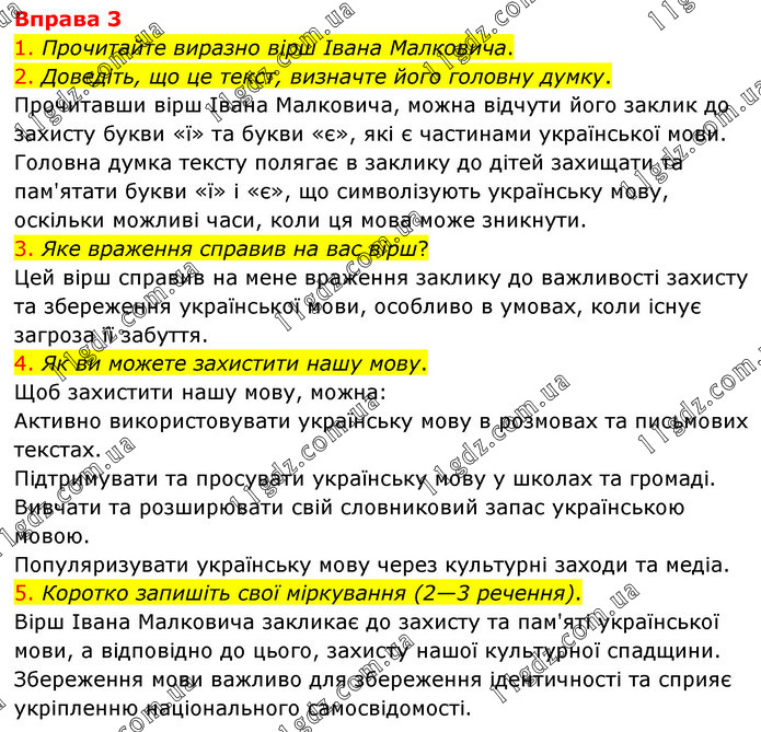 1. Прочитайте виразно вірш Івана Малковича. 2. Доведіть, що це текст, визначте його головну думку. Прочитавши вірш Івана Малковича, можна відчути його заклик до захисту букви «ї» та букви «є», які є частинами української мови. Головна думка тексту полягає в заклику до дітей захищати та пам'ятати букви «ї» і «є», що символізують українську мову, оскільки можливі часи, коли ця мова може зникнути. 3. Яке враження справив на вас вірш? Цей вірш справив на мене враження заклику до важливості захисту та збереження української мови, особливо в умовах, коли існує загроза її забуття. 4. Як ви можете захистити нашу мову. Щоб захистити нашу мову, можна: Активно використовувати українську мову в розмовах та письмових текстах. Підтримувати та просувати українську мову у школах та громаді. Вивчати та розширювати свій словниковий запас українською мовою. Популяризувати українську мову через культурні заходи та медіа. 5. Коротко запишіть свої міркування (2—3 речення). Вірш Івана Малковича закликає до захисту та пам'яті української мови, а відповідно до цього, захисту нашої культурної спадщини. Збереження мови важливо для збереження ідентичності та сприяє укріпленню національного самосвідомості.