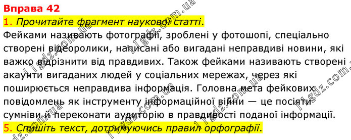 1. Прочитайте фрагмент наукової статті. Фейками називають фотографії, зроблені у фотошопі, спеціально створені відеоролики, написані або вигадані неправдиві новини, які важко відрізнити від правдивих. Також фейками називають створені акаунти вигаданих людей у соціальних мережах, через які поширюється неправдива інформація. Головна мета фейкових повідомлень як інструменту інформаційної війни — це посіяти сумніви й переконати аудиторію в правдивості поданої інформації. 5. Спишіть текст, дотримуючись правил орфографії.