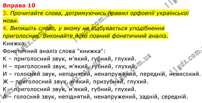 3. Прочитайте слова, дотримуючись правил орфоепії української мови. 4. Випишіть слово, у якому не відбувається уподібнення приголосних. Виконайте його повний фонетичний аналіз. Книжка. Фонетичний аналіз слова "книжка": К – приголосний звук, м'який, губний, глухий. Н – приголосний звук, м'який, губний, глухий. И – голосний звук, непіднятий, ненапружений, передній, невисокий. Ж – приголосний звук, м'який, призубний, глухий. К – приголосний звук, м'який, губний, глухий. А – голосний звук, непіднятий, ненапружений, задній, середній.