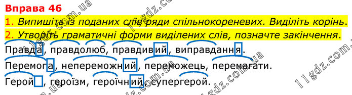 1. Випишіть із поданих слів ряди спільнокореневих. Виділіть корінь. 2. Утворіть граматичні форми виділених слів, позначте закінчення. Правда, правдолюб, правдивий, виправдання. Перемога, непереможний, переможець, перемагати. Герой , героїзм, героїчний, супергерой.