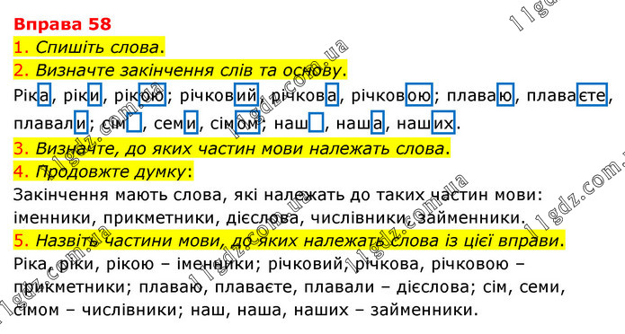 1. Спишіть слова. 2. Визначте закінчення слів та основу. Ріка, ріки, рікою; річковий, річкова, річковою; плаваю, плаваєте, плавали; сім , семи, сімом; наш , наша, наших. 3. Визначте, до яких частин мови належать слова. 4. Продовжте думку: Закінчення мають слова, які належать до таких частин мови: іменники, прикметники, дієслова, числівники, займенники. 5. Назвіть частини мови, до яких належать слова із цієї вправи. Ріка, ріки, рікою – іменники; річковий, річкова, річковою – прикметники; плаваю, плаваєте, плавали – дієслова; сім, семи, сімом – числівники; наш, наша, наших – займенники.