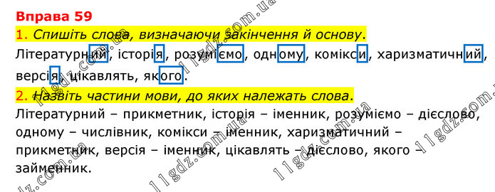 1. Спишіть слова, визначаючи закінчення й основу. Літературний, історія, розуміємо, одному, комікси, харизматичний, версія, цікавлять, якого. 2. Назвіть частини мови, до яких належать слова. Літературний – прикметник, історія – іменник, розуміємо – дієслово, одному – числівник, комікси – іменник, харизматичний – прикметник, версія – іменник, цікавлять – дієслово, якого – займенник.