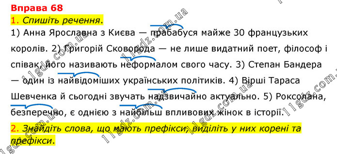 1. Спишіть речення. 1) Анна Ярославна з Києва — прабабуся майже 30 французьких королів. 2) Григорій Сковорода — не лише видатний поет, філософ і співак, його називають неформалом свого часу. 3) Степан Бандера — один із найвідоміших українських політиків. 4) Вірші Тараса Шевченка й сьогодні звучать надзвичайно актуально. 5) Роксолана, безперечно, є однією з найбільш впливових жінок в історії. 2. Знайдіть слова, що мають префікси, виділіть у них корені та префікси.