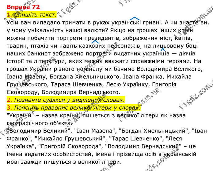 1. Спишіть текст. Усім вам випадало тримати в руках українські гривні. А чи знаєте ви, у чому унікальність нашої валюти? Якщо на грошах інших країн можна побачити портрети президентів, зображення міст, квітів, тварин, птахів чи навіть казкових персонажів, на лицьовому боці наших банкнот зображено портрети видатних українців — діячів історії та літератури, яких можна вважати справжніми героями. На грошах України різного номіналу ми бачимо Володимира Великого, Івана Мазепу, Богдана Хмельницького, Івана Франка, Михайла Грушевського, Тараса Шевченка, Лесю Українку, Григорія Сковороду, Володимира Вернадського. 2. Позначте суфікси у виділених словах. 3. Поясніть правопис великої літери у словах. "України" – назва країни, пишеться з великої літери як назва географічного об'єкта. "Володимир Великий", "Іван Мазепа", "Богдан Хмельницький", "Іван Франко", "Михайло Грушевський", "Тарас Шевченко", "Леся Українка", "Григорій Сковорода", "Володимир Вернадський" – це імена видатних особистостей, імена і прізвища осіб в українській мові завжди пишуться з великої літери.
