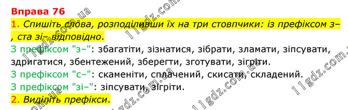 1. Спишіть слова, розподіливши їх на три стовпчики: із префіксом з–, ста зі– відповідно. З префіксом "з–": збагатіти, зізнатися, зібрати, зламати, зіпсувати, здригатися, збентежений, зберегти, зготувати, зігріти. З префіксом "с–": скаменіти, сплачений, скисати, складений. З префіксом "зі–": зіпсувати, зігріти. 2. Виділіть префікси.