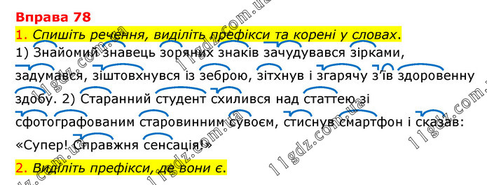 1. Спишіть речення, виділіть префікси та корені у словах. 1) Знайомий знавець зоряних знаків зачудувався зірками, задумався, зіштовхнувся із зеброю, зітхнув і згарячу з’їв здоровенну здобу. 2) Старанний студент схилився над статтею зі сфотографованим старовинним сувоєм, стиснув смартфон і сказав: «Супер! Справжня сенсація!» 2. Виділіть префікси, де вони є.