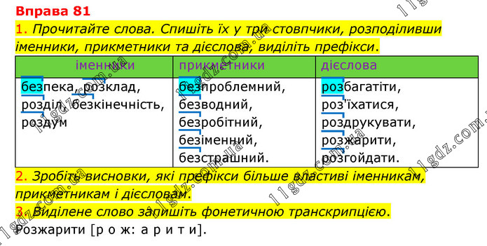 1. Прочитайте слова. Спишіть їх у три стовпчики, розподіливши іменники, прикметники та дієслова, виділіть префікси. 2. Зробіть висновки, які префікси більше властиві іменникам, прикметникам і дієсловам. 3. Виділене слово запишіть фонетичною транскрипцією. Розжарити [р о ж: а р и т и].