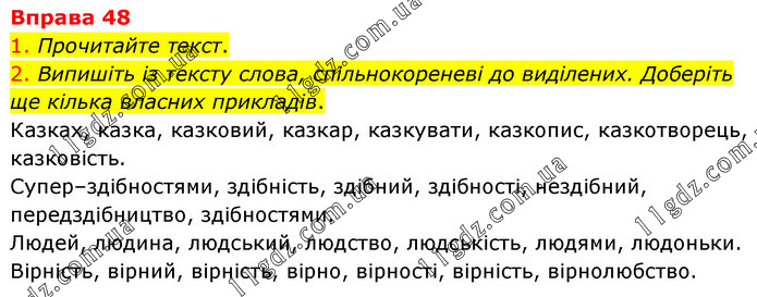 1. Прочитайте текст. 2. Випишіть із тексту слова, спільнокореневі до виділених. Доберіть ще кілька власних прикладів. Казках, казка, казковий, казкар, казкувати, казкопис, казкотворець, казковість. Супер–здібностями, здібність, здібний, здібності, нездібний, передздібництво, здібностями. Людей, людина, людський, людство, людськість, людями, людоньки. Вірність, вірний, вірність, вірно, вірності, вірність, вірнолюбство.