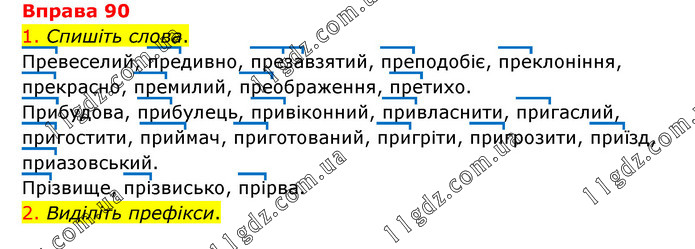 1. Спишіть слова. Превеселий, предивно, презавзятий, преподобіє, преклоніння, прекрасно, премилий, преображення, претихо. Прибудова, прибулець, привіконний, привласнити, пригаслий, пригостити, приймач, приготований, пригріти, пригрозити, приїзд, приазовський. Прізвище, прізвисько, прірва. 2. Виділіть префікси.