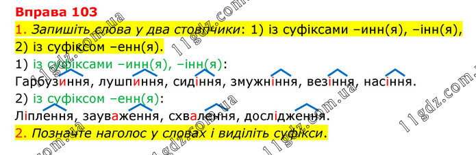 1. Запишіть слова у два стовпчики: 1) із суфіксами –инн(я), –інн(я), 2) із суфіксом –енн(я). 1) із суфіксами –инн(я), –інн(я): Гарбузиння, лушпиння, сидіння, змужніння, везіння, насіння. 2) із суфіксом –енн(я): Ліплення, зауваження, схвалення, дослідження. 2. Позначте наголос у словах і виділіть суфікси.