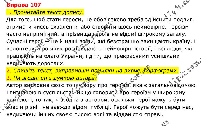 1. Прочитайте текст допису. Для того, щоб стати героєм, не обов'язково треба здійснити подвиг, отримати чиєсь схвалення або створити щось неймовірне. Героїзм часто непримітний, а прізвища героїв не відомі широкому загалу. Сучасні герої — це й наші воїни, які безстрашно захищають країну, і волонтери, про яких розповідають неймовірні історії, і всі люди, які працюють на благо України, і діти, що прекрасними усмішками надихають дорослих. 2. Спишіть текст, виправивши помилки на вивчені орфограми. 3. Чи згодні ви з думкою автора? Автор висловив свою точку зору про героїзм, яка є загальновідомою і визнаною в суспільстві. Якщо говорити про героїзм у широкому контексті, то так, я згодна з автором, оскільки герої можуть бути зовсім різні і не завжди відомі публіці. Герої можуть бути серед нас, надихаючи інших своєю силою волі та відданістю справі.