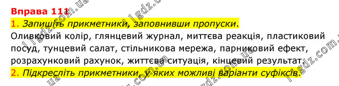 1. Запишіть прикметники, заповнивши пропуски. Оливковий колір, глянцевий журнал, миттєва реакція, пластиковий посуд, тунцевий салат, стільникова мережа, парниковий ефект, розрахунковий рахунок, життєва ситуація, кінцевий результат. 2. Підкресліть прикметники, у яких можливі варіанти суфіксів.