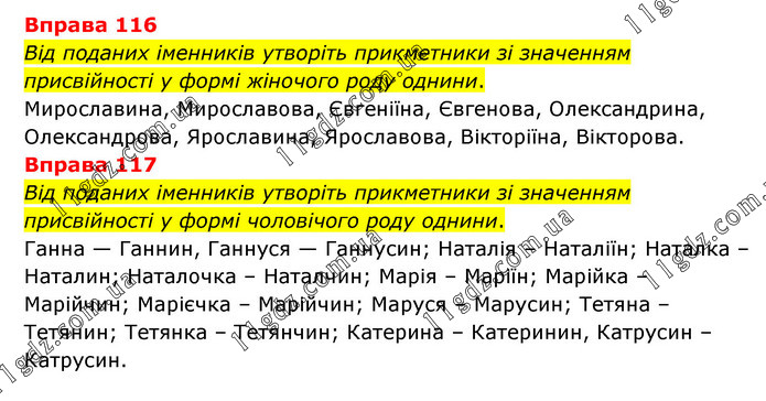 Вправа 116 Від поданих іменників утворіть прикметники зі значенням присвійності у формі жіночого роду однини. Мирославина, Мирославова, Євгеніїна, Євгенова, Олександрина, Олександрова, Ярославина, Ярославова, Вікторіїна, Вікторова. Вправа 117 Від поданих іменників утворіть прикметники зі значенням присвійності у формі чоловічого роду однини. Ганна — Ганнин, Ганнуся — Ганнусин; Наталія – Наталіїн; Наталка – Наталин; Наталочка – Наталчин; Марія – Маріїн; Марійка – Марійчин; Марієчка – Марійчин; Маруся – Марусин; Тетяна – Тетянин; Тетянка – Тетянчин; Катерина – Катеринин, Катрусин – Катрусин.