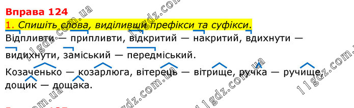 1. Спишіть слова, виділивши префікси та суфікси. Відпливти — припливти, відкритий — накритий, вдихнути — видихнути, заміський — передміський. Козаченько — козарлюга, вітерець — вітрище, ручка — ручище, дощик — дощака.