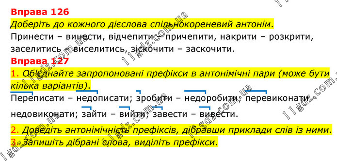 Вправа 126 Доберіть до кожного дієслова спільнокореневий антонім. Принести – винести, відчепити – причепити, накрити – розкрити, заселитись – виселитись, зіскочити – заскочити. Вправа 127 1. Об'єднайте запропоновані префікси в антонімічні пари (може бути кілька варіантів). Переписати – недописати; зробити – недоробити; перевиконати – недовиконати; зайти – вийти; завести – вивести. 2. Доведіть антонімічність префіксів, дібравши приклади слів із ними. 3. Запишіть дібрані слова, виділіть префікси.