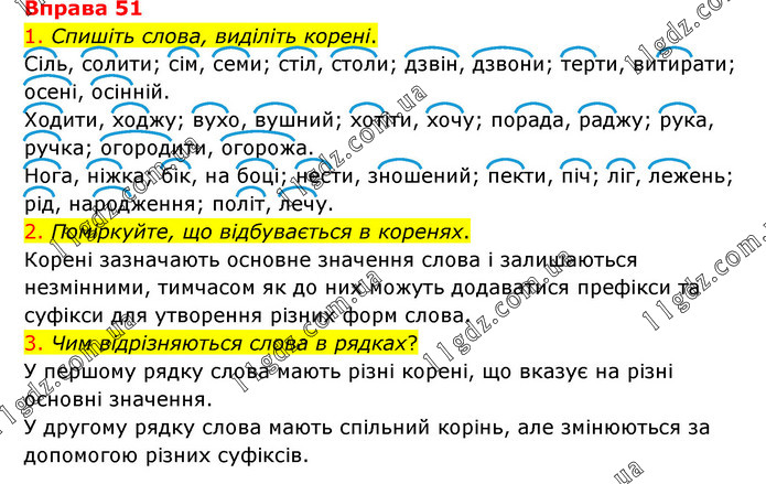 1. Спишіть слова, виділіть корені. Сіль, солити; сім, семи; стіл, столи; дзвін, дзвони; терти, витирати; осені, осінній. Ходити, ходжу; вухо, вушний; хотіти, хочу; порада, раджу; рука, ручка; огородити, огорожа. Нога, ніжка; бік, на боці; нести, зношений; пекти, піч; ліг, лежень; рід, народження; політ, лечу. 2. Поміркуйте, що відбувається в коренях. Корені зазначають основне значення слова і залишаються незмінними, тимчасом як до них можуть додаватися префікси та суфікси для утворення різних форм слова. 3. Чим відрізняються слова в рядках? У першому рядку слова мають різні корені, що вказує на різні основні значення. У другому рядку слова мають спільний корінь, але змінюються за допомогою різних суфіксів.