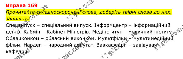 Прочитайте складноскорочені слова, доберіть твірні слова до них, запишіть. Спецвипуск – спеціальний випуск. Інформцентр – інформаційний центр. Кабмін – Кабінет Міністрів. Медінститут – медичний інститут. Облвиконком – обласний виконком. Мультфільм – мультимедійний фільм. Нардеп – народний депутат. Завкафедри – завідувач кафедри.