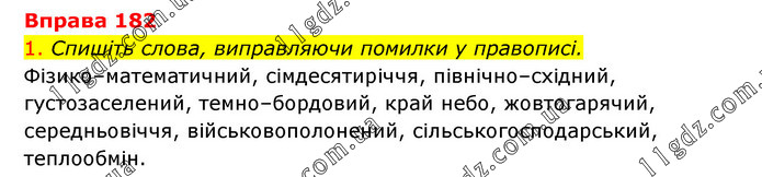 1. Спишіть слова, виправляючи помилки у правописі. Фізико–математичний, сімдесятиріччя, північно–східний, густозаселений, темно–бордовий, край небо, жовтогарячий, середньовіччя, військовополонений, сільськогосподарський, теплообмін.