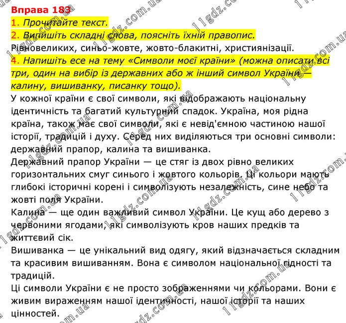 1. Прочитайте текст. 2. Випишіть складні слова, поясніть їхній правопис. Рівновеликих, синьо-жовте, жовто-блакитні, християнізації. 4. Напишіть есе на тему «Символи моєї країни» (можна описати всі три, один на вибір із державних або ж інший символ України — калину, вишиванку, писанку тощо). У кожної країни є свої символи, які відображають національну ідентичність та багатий культурний спадок. Україна, моя рідна країна, також має свої символи, які є невід'ємною частиною нашої історії, традицій і духу. Серед них виділяються три основні символи: державний прапор, калина та вишиванка. Державний прапор України — це стяг із двох рівно великих горизонтальних смуг синього і жовтого кольорів. Ці кольори мають глибокі історичні корені і символізують незалежність, сине небо та жовті поля України. Калина — ще один важливий символ України. Це кущ або дерево з червоними ягодами, які символізують кров наших предків та життєвий сік. Вишиванка — це унікальний вид одягу, який відзначається складним та красивим вишиванням. Вона є символом національної гідності та традицій. Ці символи України є не просто зображеннями чи кольорами. Вони є живим вираженням нашої ідентичності, нашої історії та наших цінностей.