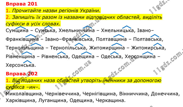 Вправа 201 1. Прочитайте назви регіонів України. 2. Запишіть їх разом із назвами відповідних областей, виділіть суфікси в усіх словах. Сумщина – Сумська, Хмельниччина – Хмельницька, Івано–Франківщина – Івано–Франківська, Полтавщина – Полтавська, Тернопільщина – Тернопільська, Житомирщина – Житомирська, Рівненщина – Рівненська, Одещина – Одеська, Херсонщина – Херсонська. Вправа 202 1. Від поданих назв областей утворіть іменники за допомогою суфікса –ин–. Миколаївщина, Чернівеччина, Чернігівщина, Вінниччина, Донеччина, Харківщина, Луганщина, Одещина, Черкащина.