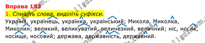 1. Спишіть слова, виділіть суфікси. Україна, українець, українка, український; Микола, Миколка, Миколин; великий, великуватий, величезний, величний; ніс, носик, носище, носовий; держава, державність, державний.