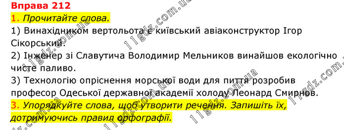 1. Прочитайте слова. 1) Винахідником вертольота є київський авіаконструктор Ігор Сікорський. 2) Інженер зі Славутича Володимир Мельников винайшов екологічно чисте паливо. 3) Технологію опріснення морської води для пиття розробив професор Одеської державної академії холоду Леонард Смирнов. 3. Упорядкуйте слова, щоб утворити речення. Запишіть їх, дотримуючись правил орфографії.