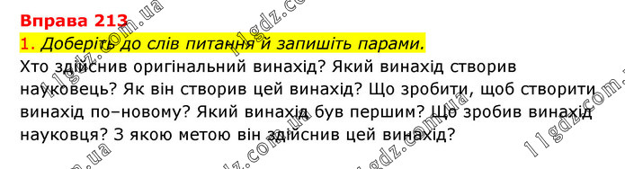 1. Доберіть до слів питання й запишіть парами. Хто здійснив оригінальний винахід? Який винахід створив науковець? Як він створив цей винахід? Що зробити, щоб створити винахід по–новому? Який винахід був першим? Що зробив винахід науковця? З якою метою він здійснив цей винахід?
